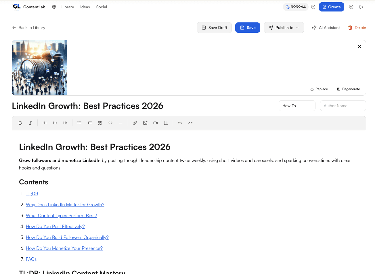 Generate long-form, SEO-optimised articles from a topic or idea in seconds. Choose your tone — Informative, Persuasive, Formal, Humorous, Inspirational — and your content category. ContentLab builds the full article, complete with title, sections, and a cover image.